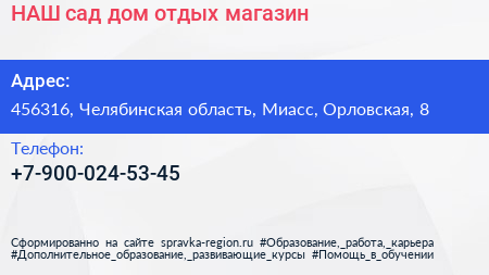 НАШ сад дом отдых, магазин по адресу 456316, Челябинская область, Миасс, Орловская, 8 в дальнейшем Организация, размещена в следующих категориях: