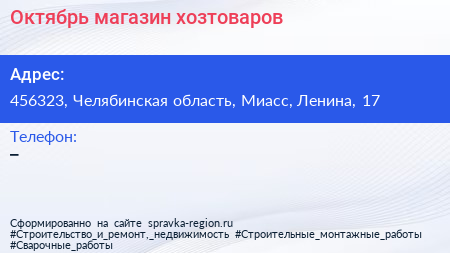Октябрь, магазин хозтоваров по адресу 456323, Челябинская область, Миасс, Ленина, 17 в дальнейшем Организация, размещена в следующих категориях: