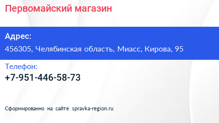 Первомайский, магазин по адресу 456305, Челябинская область, Миасс, Кирова, 95 в дальнейшем Организация, размещена в следующих категориях: