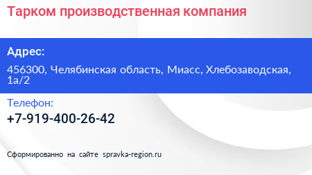 Тарком, производственная компания по адресу 456300, Челябинская область, Миасс, Хлебозаводская, 1а/2 в дальнейшем Организация, размещена в следующих категориях: