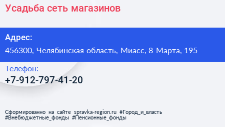 Усадьба, сеть магазинов по адресу 456300, Челябинская область, Миасс, 8 Марта, 195 в дальнейшем Организация, размещена в следующих категориях:
