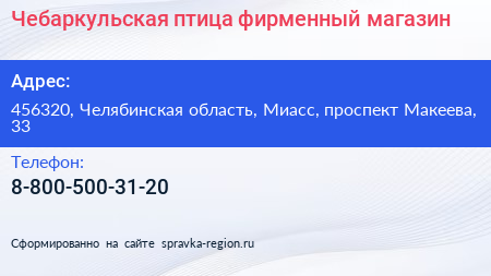 Чебаркульская птица, фирменный магазин по адресу 456320, Челябинская область, Миасс, проспект Макеева, 33 в дальнейшем Организация, размещена в следующих категориях: