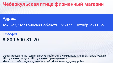 Чебаркульская птица, фирменный магазин по адресу 456323, Челябинская область, Миасс, Октябрьская, 2/1 в дальнейшем Организация, размещена в следующих категориях: