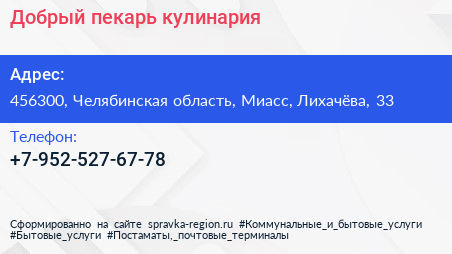 Добрый пекарь, кулинария по адресу 456300, Челябинская область, Миасс, Лихачёва, 33 в дальнейшем Организация, размещена в следующих категориях: