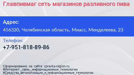 Главпивмаг, сеть магазинов разливного пива по адресу 456320, Челябинская область, Миасс, Менделеева, 23 в дальнейшем Организация, размещена в следующих категориях: