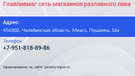 Главпивмаг, сеть магазинов разливного пива по адресу 456302, Челябинская область, Миасс, Пушкина, 56а в дальнейшем Организация, размещена в следующих категориях: