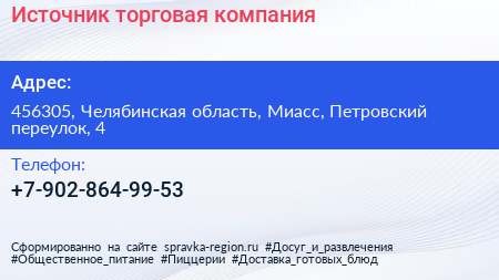 Источник, торговая компания по адресу 456305, Челябинская область, Миасс, Петровский переулок, 4 в дальнейшем Организация, размещена в следующих категориях: