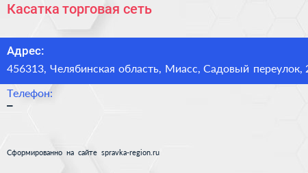 Касатка, торговая сеть по адресу 456313, Челябинская область, Миасс, Садовый переулок, 2 в дальнейшем Организация, размещена в следующих категориях:
