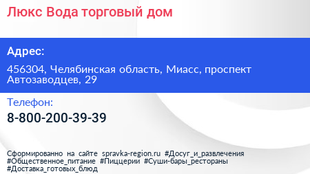 Люкс-Вода, торговый дом по адресу 456304, Челябинская область, Миасс, проспект Автозаводцев, 29 в дальнейшем Организация, размещена в следующих категориях: