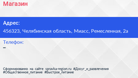 Магазин по адресу 456323, Челябинская область, Миасс, Ремесленная, 2а в дальнейшем Организация, размещена в следующих категориях: