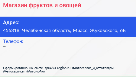 Магазин фруктов и овощей по адресу 456318, Челябинская область, Миасс, Жуковского, 6Б в дальнейшем Организация, размещена в следующих категориях: