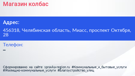 Магазин колбас по адресу 456318, Челябинская область, Миасс, проспект Октября, 28 в дальнейшем Организация, размещена в следующих категориях: