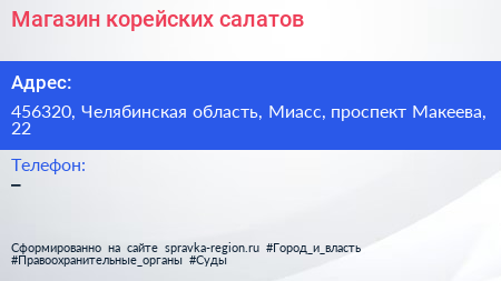 Магазин корейских салатов по адресу 456320, Челябинская область, Миасс, проспект Макеева, 22 в дальнейшем Организация, размещена в следующих категориях: