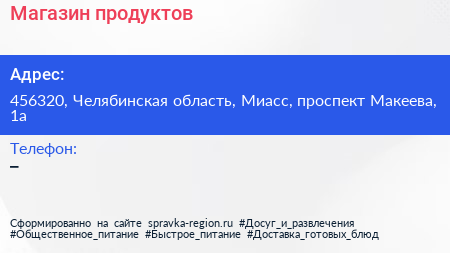 Магазин продуктов по адресу 456320, Челябинская область, Миасс, проспект Макеева, 1а в дальнейшем Организация, размещена в следующих категориях: