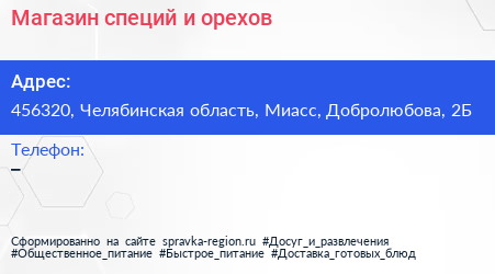 Магазин специй и орехов по адресу 456320, Челябинская область, Миасс, Добролюбова, 2Б в дальнейшем Организация, размещена в следующих категориях: