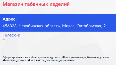 Магазин табачных изделий по адресу 456323, Челябинская область, Миасс, Октябрьская, 2 в дальнейшем Организация, размещена в следующих категориях: