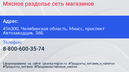 Мясное раздолье, сеть магазинов по адресу 456300, Челябинская область, Миасс, проспект Автозаводцев, 36Б в дальнейшем Организация, размещена в следующих категориях: