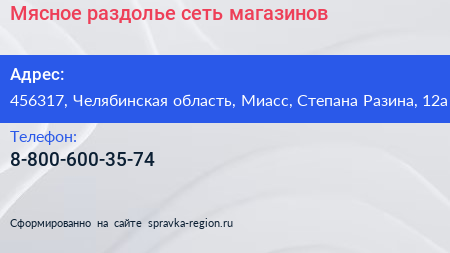 Мясное раздолье, сеть магазинов по адресу 456317, Челябинская область, Миасс, Степана Разина, 12а в дальнейшем Организация, размещена в следующих категориях: