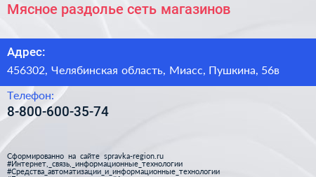 Мясное раздолье, сеть магазинов по адресу 456302, Челябинская область, Миасс, Пушкина, 56в в дальнейшем Организация, размещена в следующих категориях: