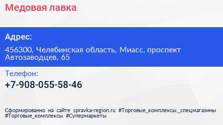Медовая лавка по адресу 456300, Челябинская область, Миасс, проспект Автозаводцев, 65 в дальнейшем Организация, размещена в следующих категориях:
