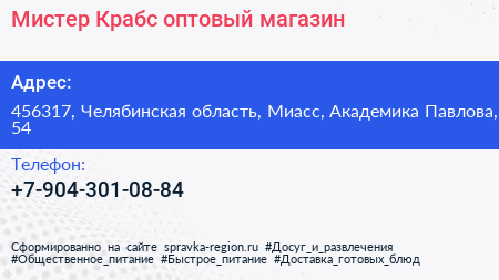 Мистер Крабс, оптовый магазин по адресу 456317, Челябинская область, Миасс, Академика Павлова, 54 в дальнейшем Организация, размещена в следующих категориях: