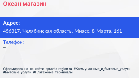 Океан, магазин по адресу 456317, Челябинская область, Миасс, 8 Марта, 161 в дальнейшем Организация, размещена в следующих категориях: