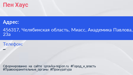 Пен Хаус по адресу 456317, Челябинская область, Миасс, Академика Павлова, 23а в дальнейшем Организация, размещена в следующих категориях: