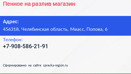 Пенное на разлив, магазин по адресу 456318, Челябинская область, Миасс, Попова, 6 в дальнейшем Организация, размещена в следующих категориях: