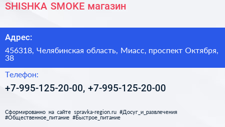 SHISHKA SMOKE, магазин по адресу 456318, Челябинская область, Миасс, проспект Октября, 38 в дальнейшем Организация, размещена в следующих категориях: