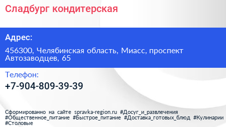 Сладбург, кондитерская по адресу 456300, Челябинская область, Миасс, проспект Автозаводцев, 65 в дальнейшем Организация, размещена в следующих категориях: