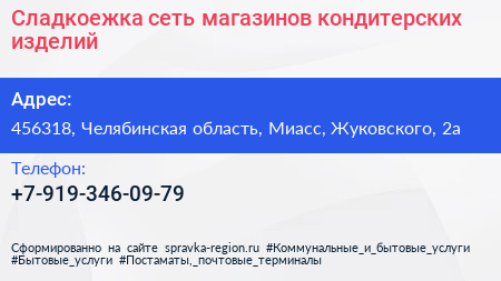 Сладкоежка, сеть магазинов кондитерских изделий по адресу 456318, Челябинская область, Миасс, Жуковского, 2а в дальнейшем Организация, размещена в следующих категориях: