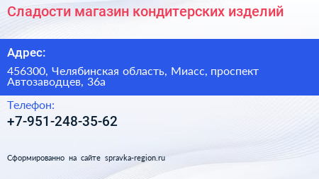 Сладости, магазин кондитерских изделий по адресу 456300, Челябинская область, Миасс, проспект Автозаводцев, 36а в дальнейшем Организация, размещена в следующих категориях: