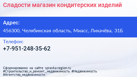 Сладости, магазин кондитерских изделий по адресу 456300, Челябинская область, Миасс, Лихачёва, 31Б в дальнейшем Организация, размещена в следующих категориях: