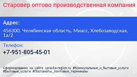 Старовер, оптово-производственная компания по адресу 456300, Челябинская область, Миасс, Хлебозаводская, 1а/2 в дальнейшем Организация, размещена в следующих категориях: