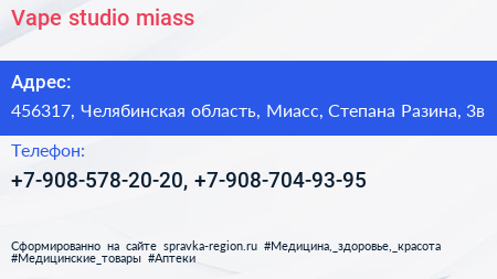 Vape studio miass по адресу 456317, Челябинская область, Миасс, Степана Разина, 3в в дальнейшем Организация, размещена в следующих категориях: