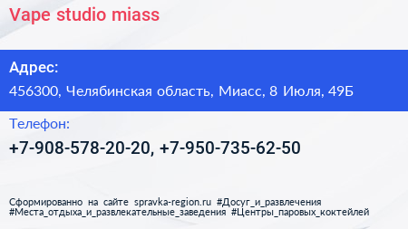Vape studio miass по адресу 456300, Челябинская область, Миасс, 8 Июля, 49Б в дальнейшем Организация, размещена в следующих категориях: