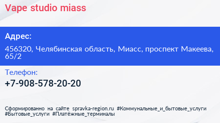 Vape studio miass по адресу 456320, Челябинская область, Миасс, проспект Макеева, 65/2 в дальнейшем Организация, размещена в следующих категориях: