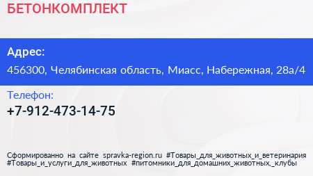 БЕТОНКОМПЛЕКТ по адресу 456300, Челябинская область, Миасс, Набережная, 28а/4 в дальнейшем Организация, размещена в следующих категориях: