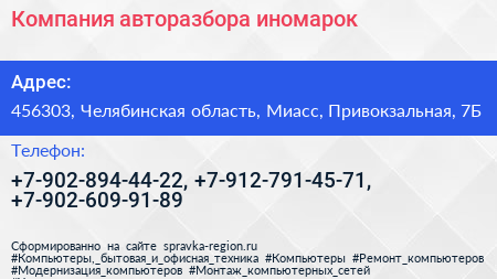 Компания авторазбора иномарок по адресу 456303, Челябинская область, Миасс, Привокзальная, 7Б в дальнейшем Организация, размещена в следующих категориях: