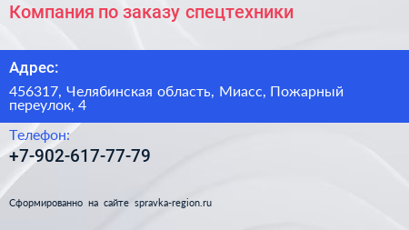 Компания по заказу спецтехники по адресу 456317, Челябинская область, Миасс, Пожарный переулок, 4 в дальнейшем Организация, размещена в следующих категориях: