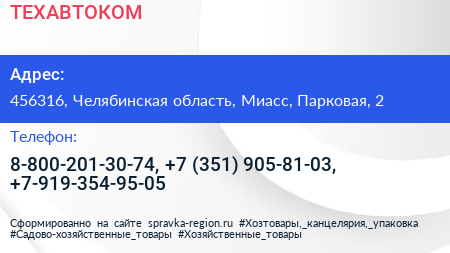 ТЕХАВТОКОМ по адресу 456316, Челябинская область, Миасс, Парковая, 2 в дальнейшем Организация, размещена в следующих категориях: