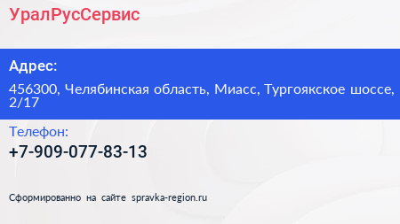 УралРусСервис по адресу 456300, Челябинская область, Миасс, Тургоякское шоссе, 2/17 в дальнейшем Организация, размещена в следующих категориях: