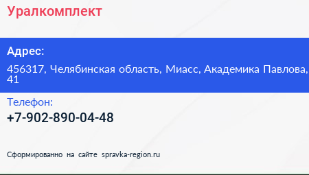 Уралкомплект по адресу 456317, Челябинская область, Миасс, Академика Павлова, 41 в дальнейшем Организация, размещена в следующих категориях: