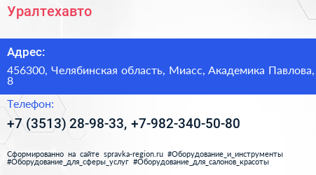 Уралтехавто по адресу 456300, Челябинская область, Миасс, Академика Павлова, 8 в дальнейшем Организация, размещена в следующих категориях: