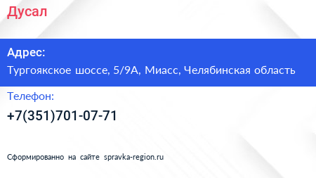 Дусал по адресу Тургоякское шоссе, 5/9А, Миасс, Челябинская область в дальнейшем Организация, размещена в следующих категориях: