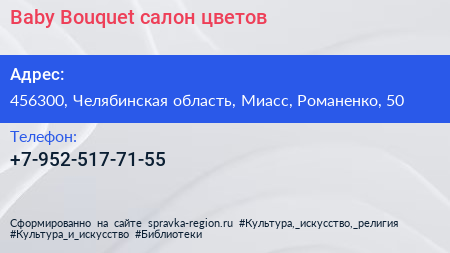 Baby Bouquet, салон цветов по адресу 456300, Челябинская область, Миасс, Романенко, 50 в дальнейшем Организация, размещена в следующих категориях: