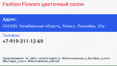 Fashion Flowers, цветочный салон по адресу 456300, Челябинская область, Миасс, Лихачёва, 25а в дальнейшем Организация, размещена в следующих категориях: