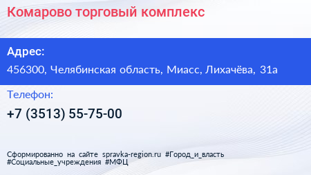 Комарово, торговый комплекс по адресу 456300, Челябинская область, Миасс, Лихачёва, 31а в дальнейшем Организация, размещена в следующих категориях:
