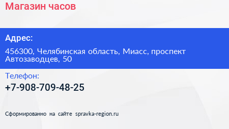 Магазин часов по адресу 456300, Челябинская область, Миасс, проспект Автозаводцев, 50 в дальнейшем Организация, размещена в следующих категориях: