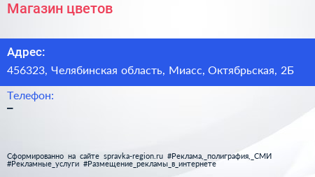 Магазин цветов по адресу 456323, Челябинская область, Миасс, Октябрьская, 2Б в дальнейшем Организация, размещена в следующих категориях:
